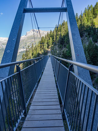 Wir überqueren die Brücke, geniessen noch ein wenig die Aussicht aufs Wallis und kehren dann auf dem selben Weg zurück nach Crans-Montana. Alternativ kann man der Suone noch bis zum Tseuzier-Staudamm folgen und von dort per Bus (Fahrplan beachten, er fährt nur selten) nach Hause fahren.