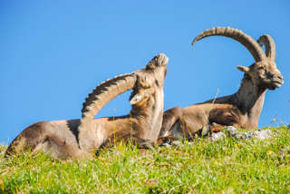 Auf diese Begegnung hofft jeder Wanderer auf der Steinbocktour – zwei majestätische Steinböcke sonnen sich bei der Fiderescharte