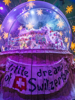 Für Freunde des Kitsches gibt es auf dem Jungfraujoch so einiges zu sehen. Eine riesige Schneekugel mit allem, was der internationale Tourist sich von der Schweiz vorstellt – Jodler, Kühe, Berge, Seilbahnen und vieles mehr. Umrahmt von beleuchteten Edelweiss. Ach herrje, denken wir uns nur. Aber es scheint bei den Gästen gut anzukommen.