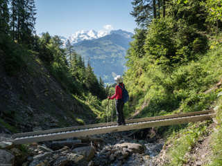 Was wir noch nicht wissen – bevor wir tatsächlich an die Hänge des Niesen kommen, müssen wir noch einen Tobel passieren. Und dafür geht es erst mal wieder einige Höhenmeter nach unten. Auf schmalen Pfaden geht es den Hang entlang. Ein paar Mal queren wir auf etwas wackligen Metallbrücken Bergbäche. Die Brücken haben kein Geländer, sie sind aber breit genug, dass auch ein ängstliches Gemüt wie BabyMufflon drüber kommt.